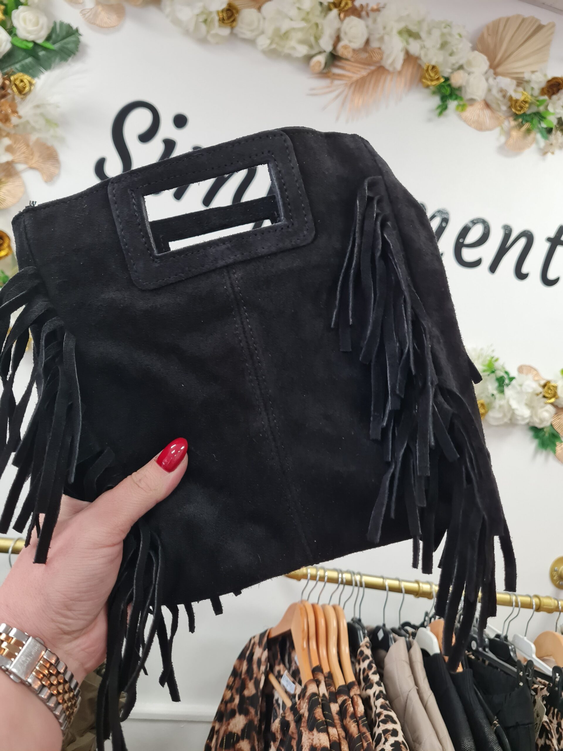 sac en daim noir avec bandoulière réglable