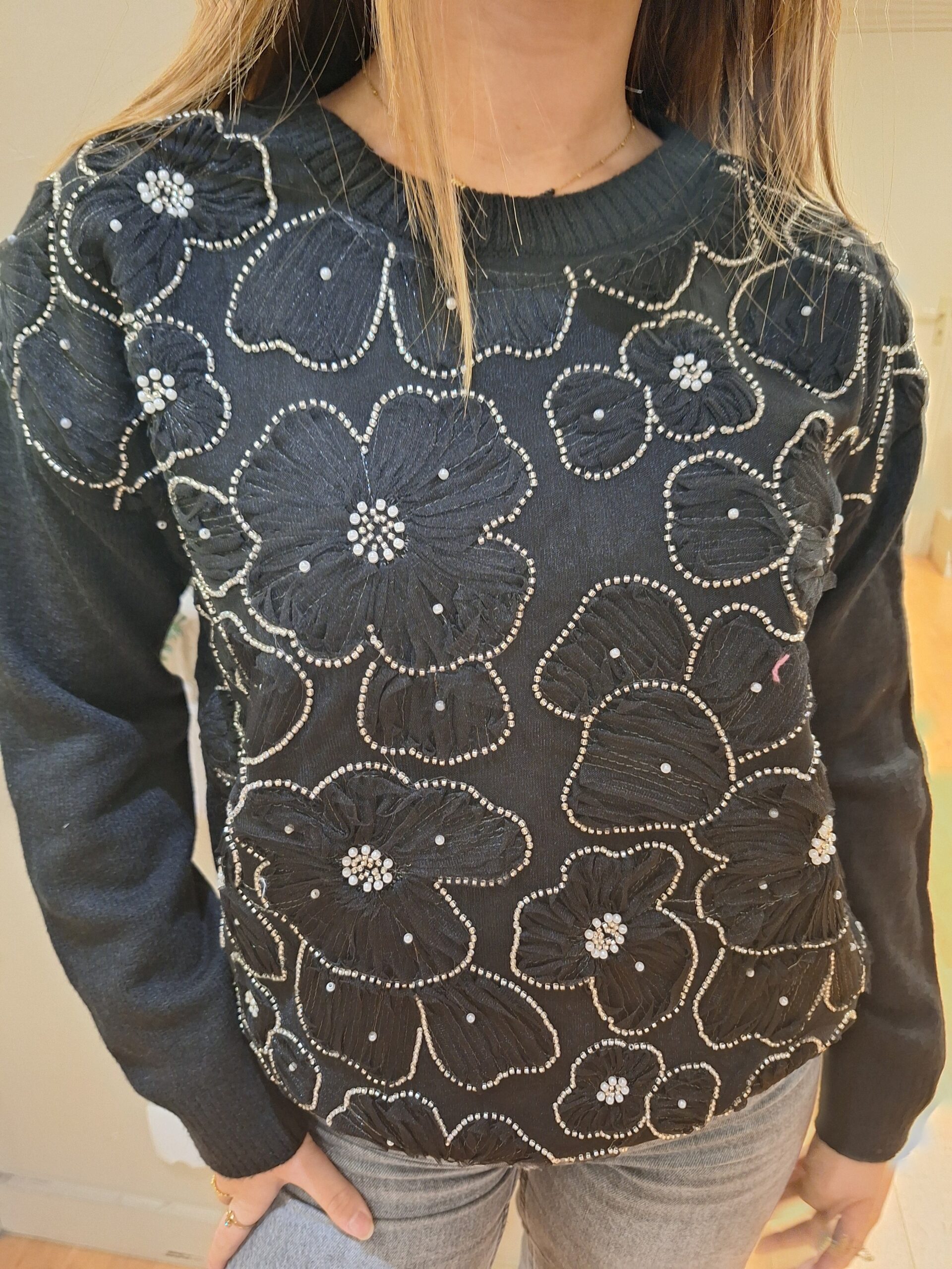 pull noir perlé fleur rosa