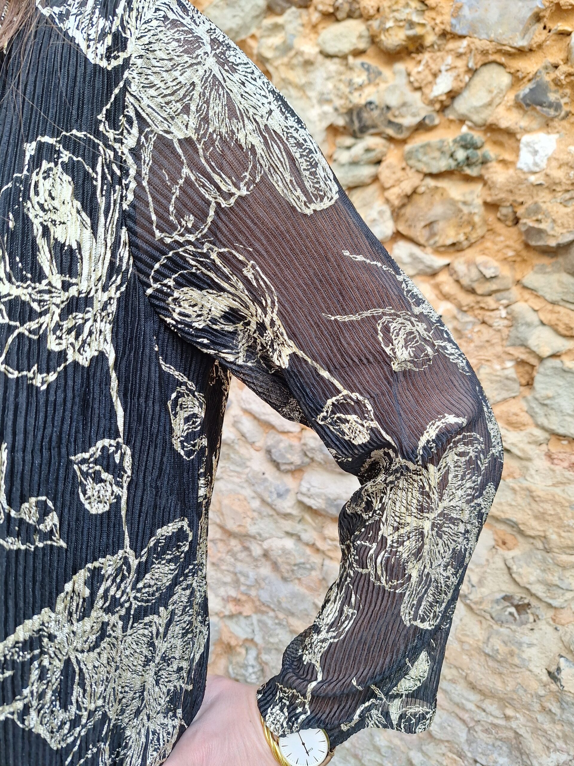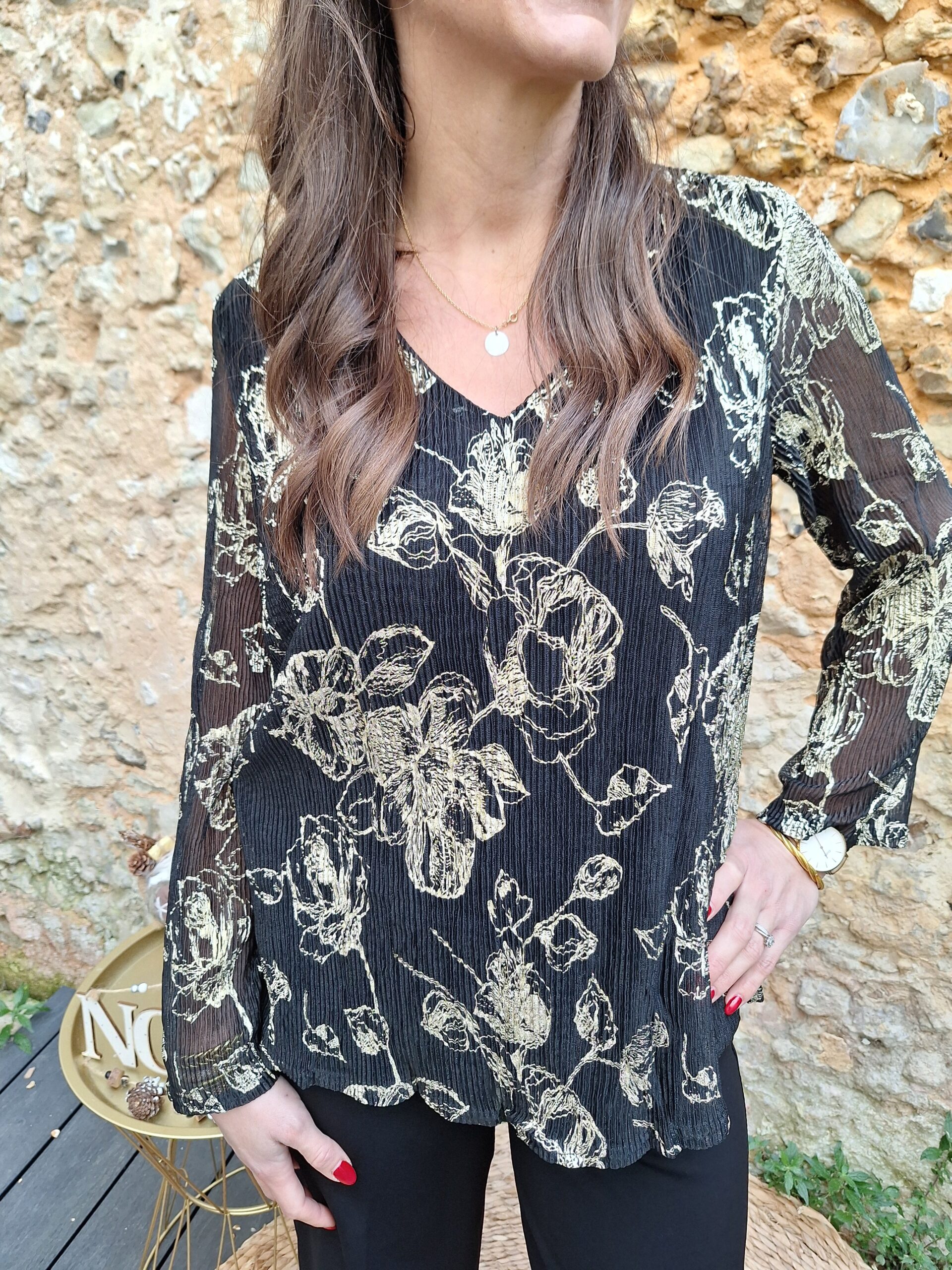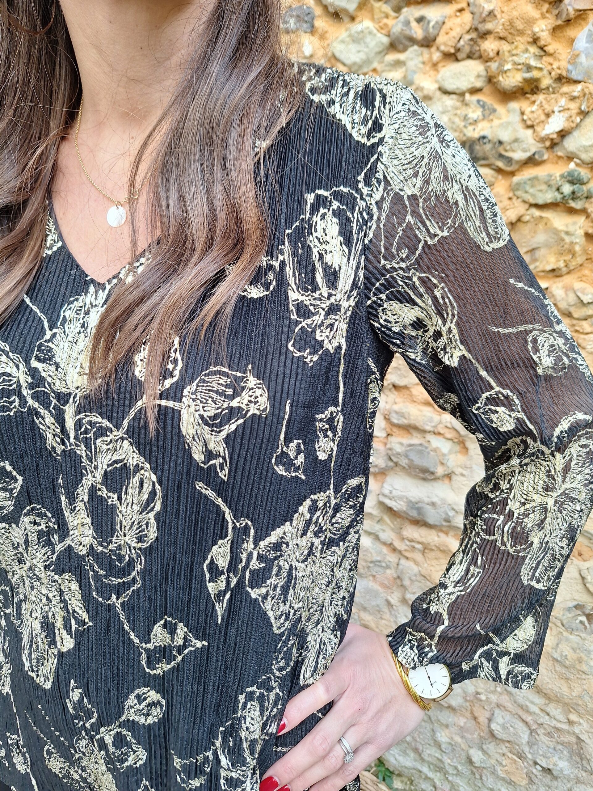 top noir brodé de fleurs couleur or